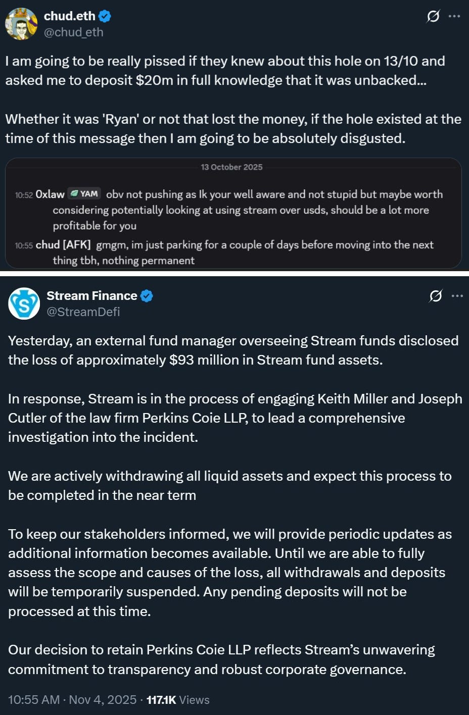 The scam got exposed once Stream Finance admitted to losing $93 million. This is likely a gap they incurred on October 10th and they did their best to plug it by getting more investors trapped before the collapse.