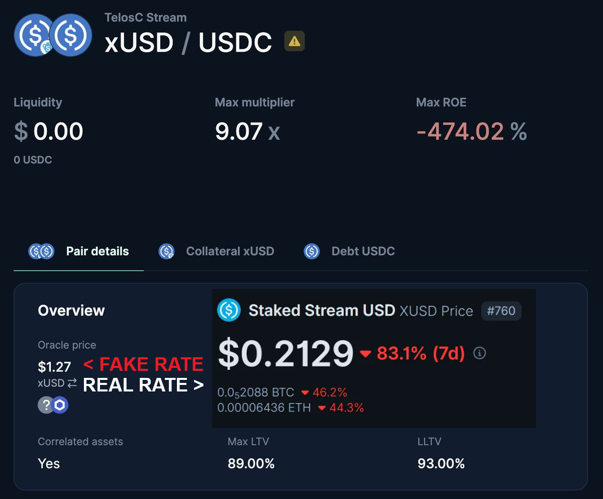Especially because the xUSD oracle price was hardcoded across protocols above $1 and disconnected from real market rates. Even if xUSD is worth about 20 cents today, its price is still above $1 on Euler, see image.