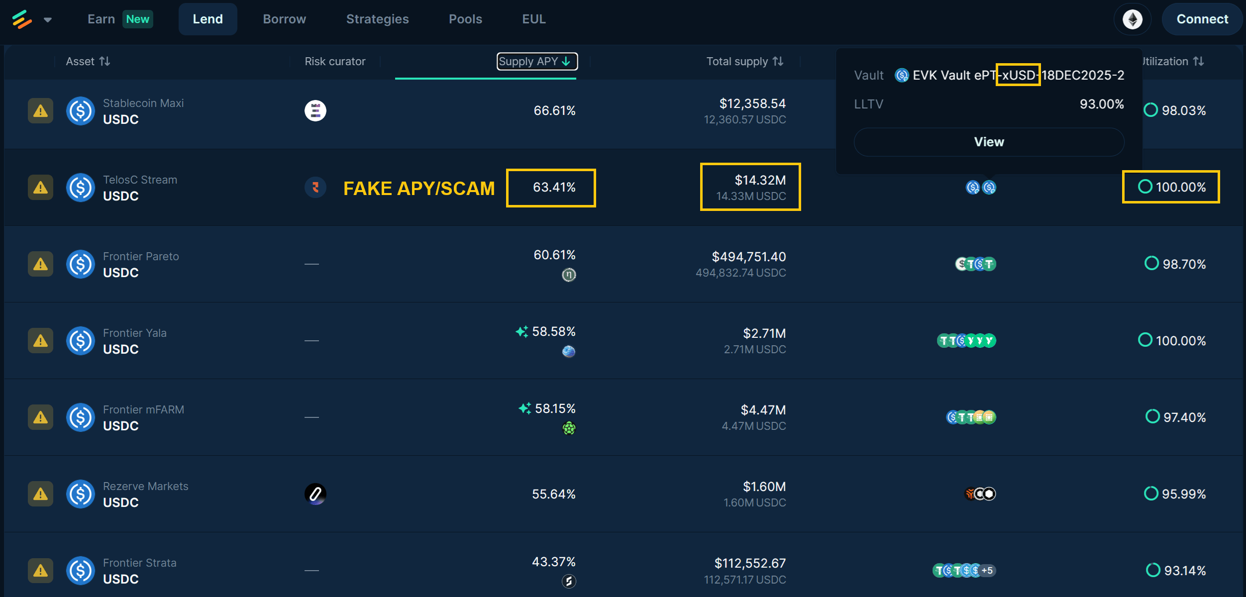 Liquidity already left many vaults on Euler as users withdraw funds to seek safety. That’s why the APY on these vaults exploded. It wants you to deposit USDC. Don’t fall for it, especially if they use that to farm scams like xUSD.