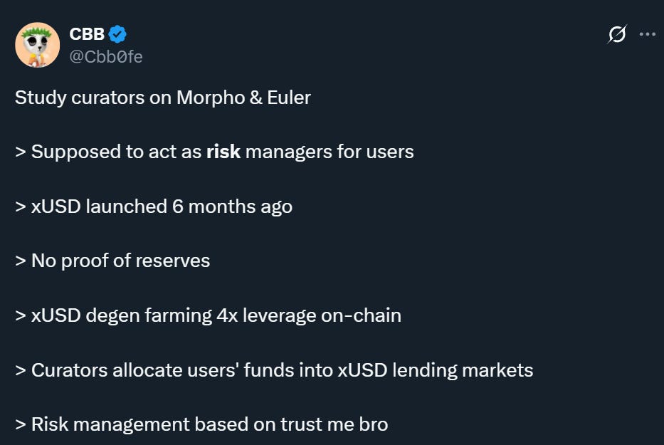 The protocols and curators facilitating this process are complicit in this. That includes Morpho, Euler, Silo, and all curators that touched xUSD.