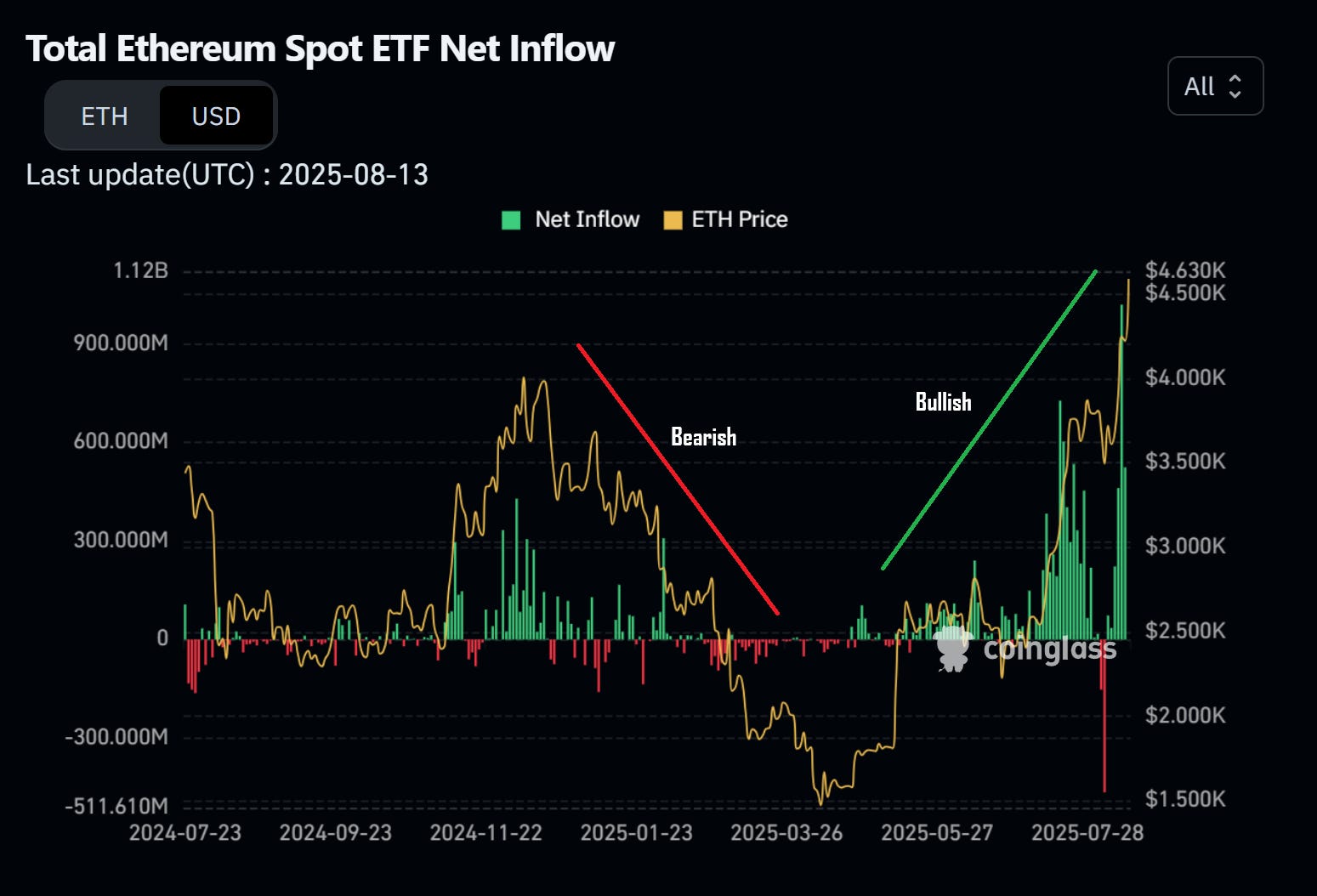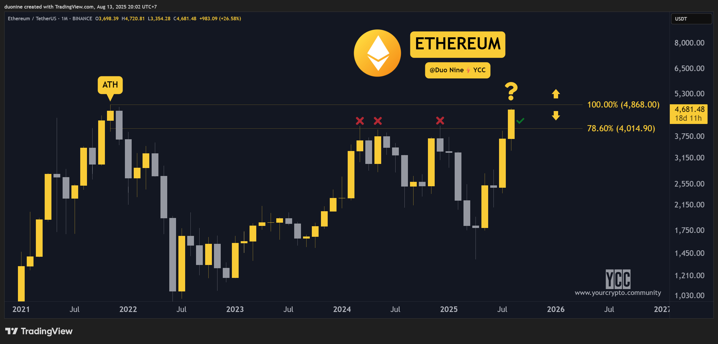 The price already broke above $4,000 in early August. In 2024, this level acted as resistance three times. The road is now clear for a major test of the ATH.