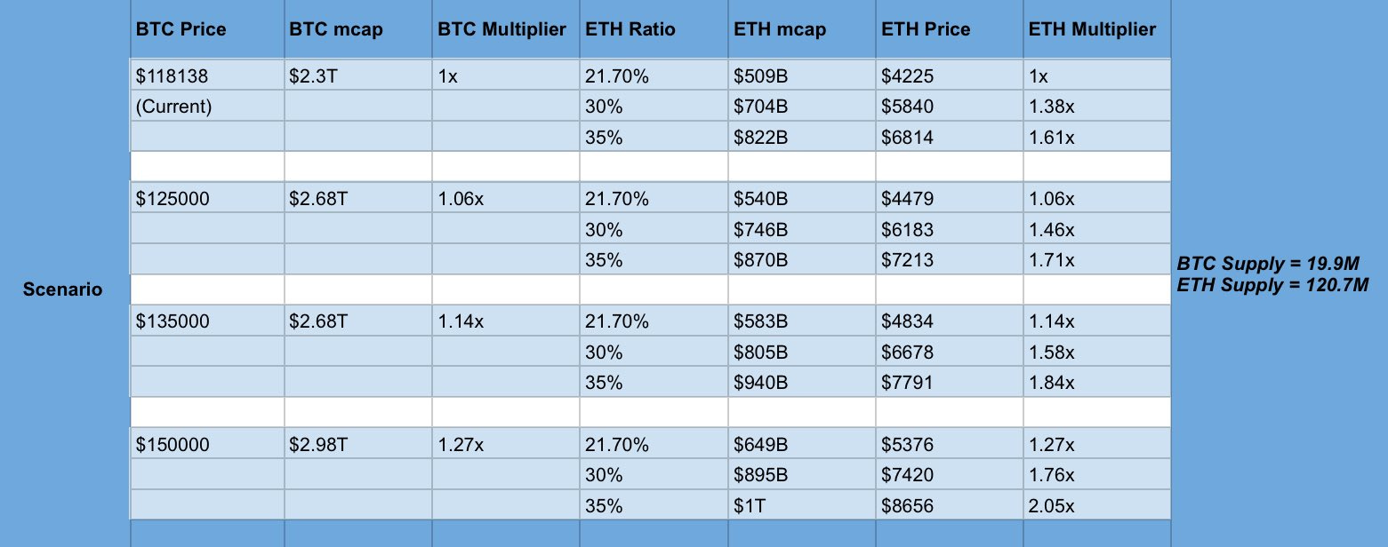 However, Bitcoin may well go higher in the coming months. For example, if BTC hits a price of $150,000, then Ethereum could realistically approach $9,000 based on the above chart. Below a table with some similar scenarios.