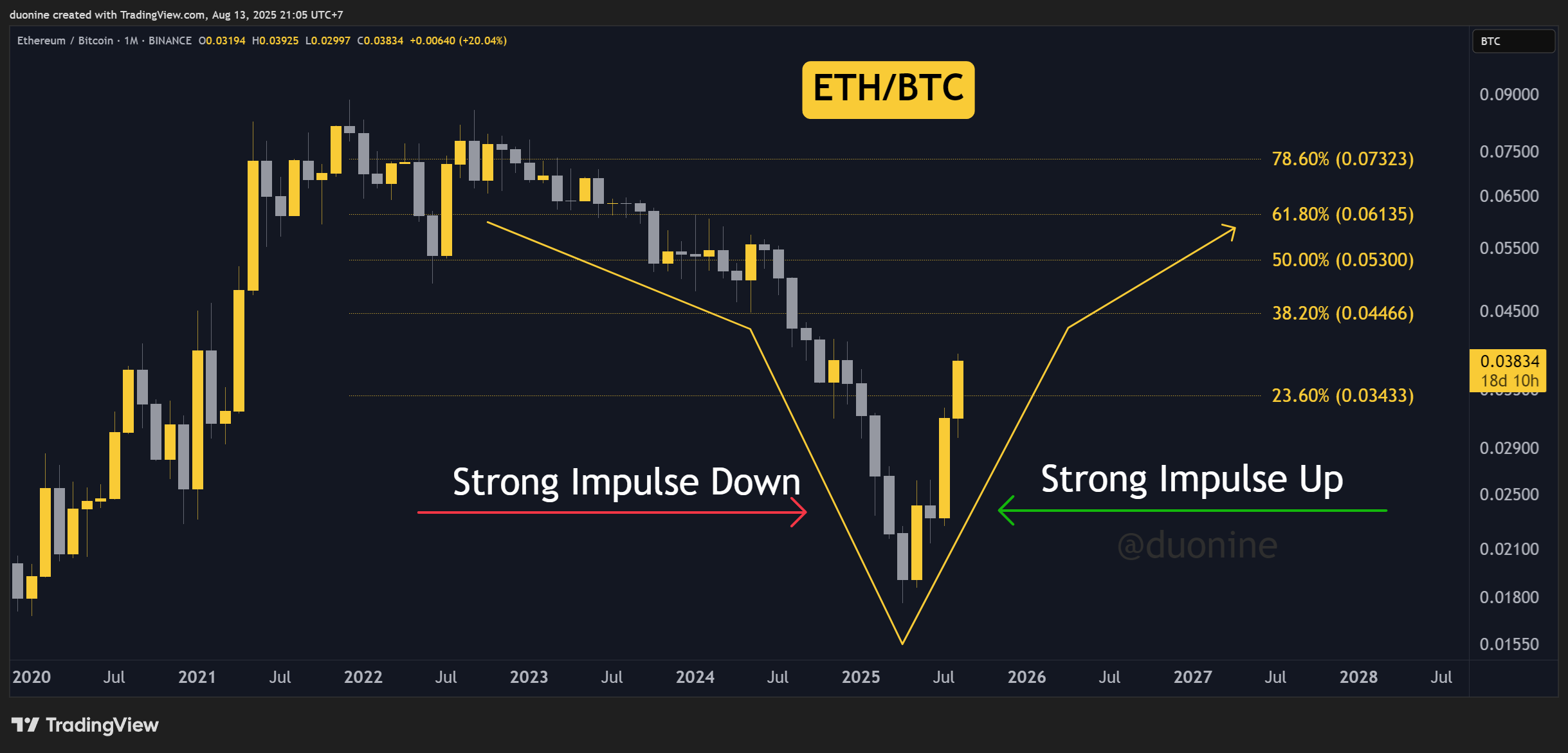 As you can see below, Ethereum bottomed against Bitcoin around April 2025. Since then, it’s been a non-stop pump to recover most of the losses from earlier this year. We can also call this a classic V reversal.