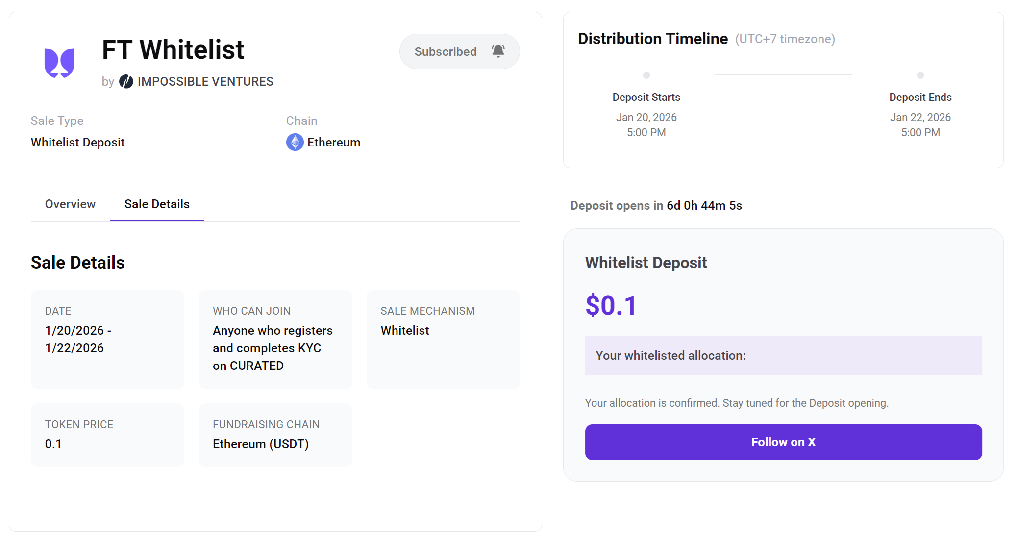 The whitelist sale takes place between 20-22 January 2026. The public sale is expected in early February. The whitelisting for Patrons Pro was made possible via Impossible Finance in collaboration with YCC. If you made it on that list, congratulations! Over $150,000 or 1.5 million FT tokens were reserved for our members.