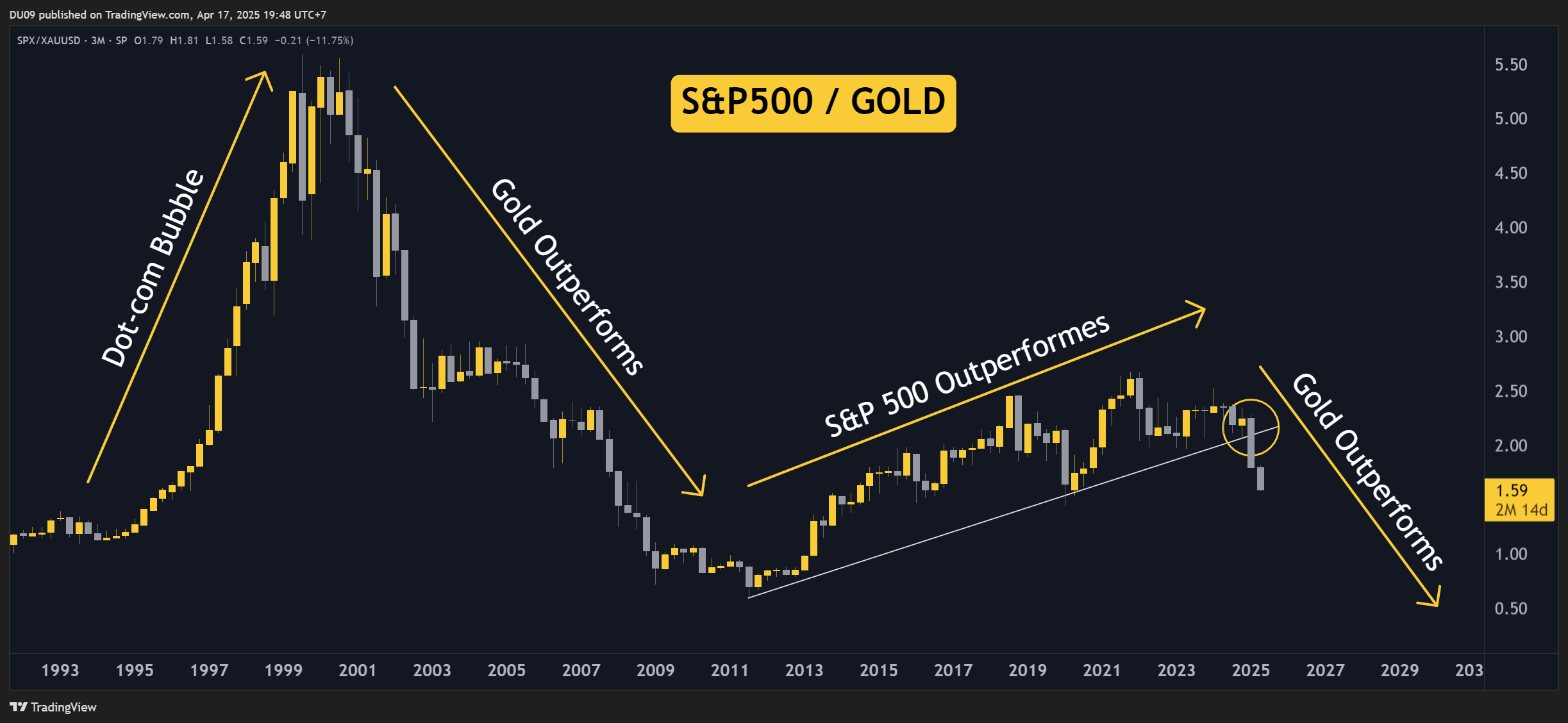 Another way to look at this is to use the S&P500/Gold ratio. Gold outperformed between 2000 and 2013, then underperformed until around 2021. Since 2022, holding Gold was better, and in early 2025, the S&P 500 suffered a major breakdown against Gold. See the yellow circle on the chart.