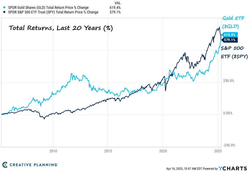 Moreover, the Gold ETF was launched in 2004. If you bought Gold back then, 20 years later, you’d outperform the S&P 500 today. Just look at the chart. The lines are inverting! Gold sits at 619% and the S&P 500 at 579% over a 20 year period.