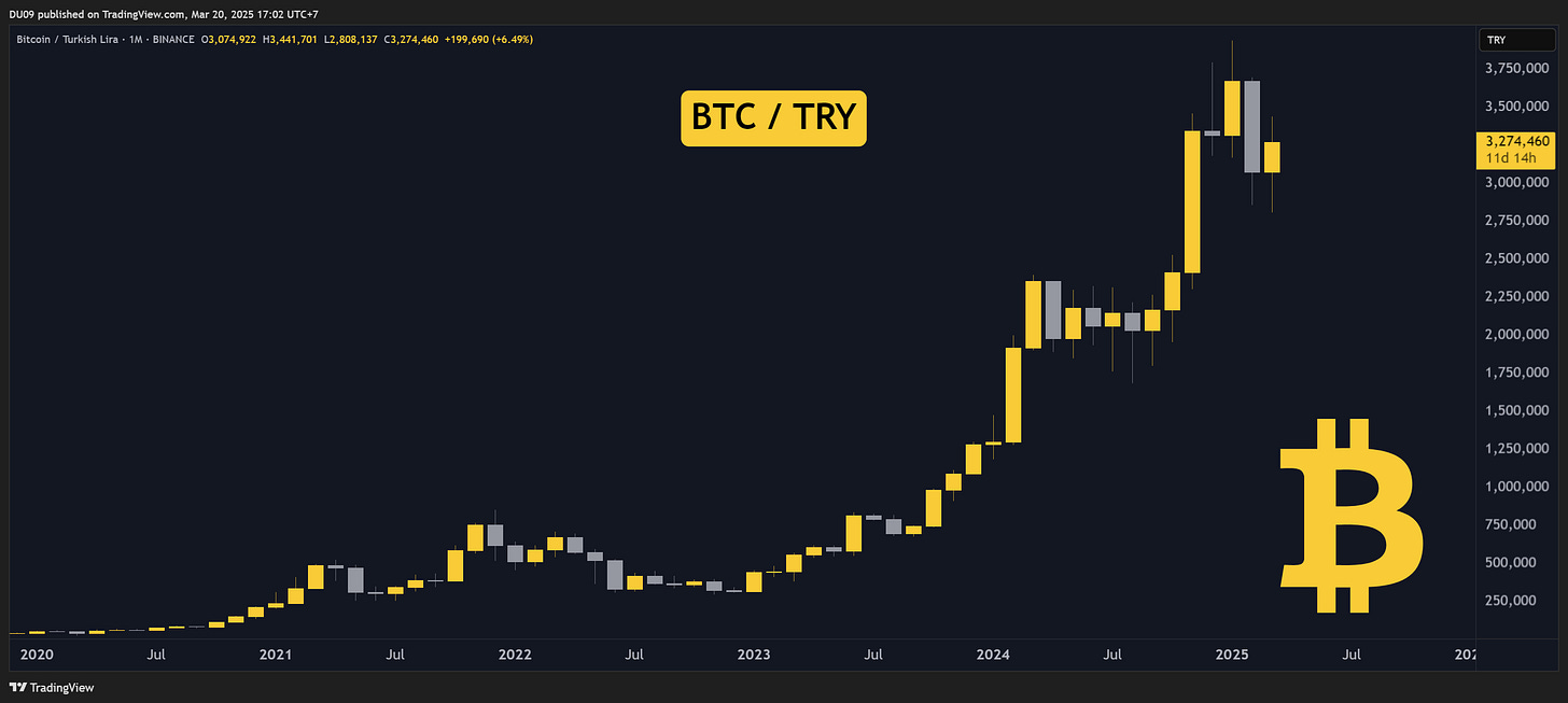 The Global Money Supply is making all-time highs - it’s not just the US that’s diluting their citizens, everyone is doing it. The only thing that differs is the speed of it. Here is Bitcoin’s price in Turkish liras. Ouch!