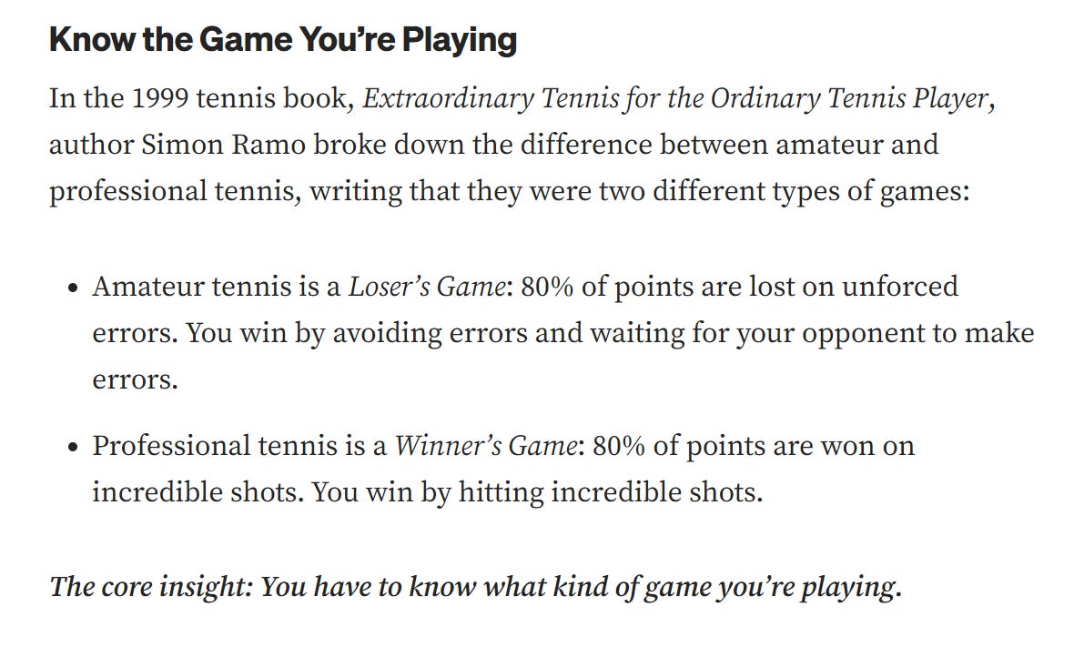 In the first case, the tennis players must do their best to reduce their mistakes since simply by doing that they will beat most of their competitors which make many mistakes. It’s a losers game, because losing less points than the majority makes you a winner.