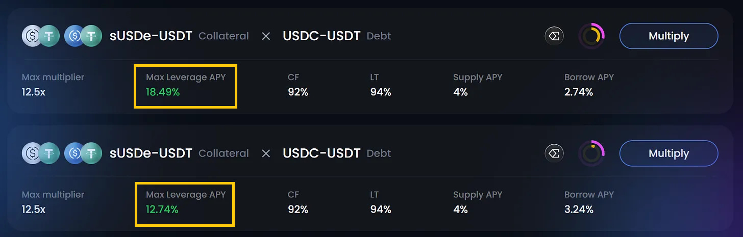 You can also multiply your stablecoin yields by using leverage. As long as you trust the peg of paired stablecoins (like USDe), you can reach over 12-18% APY.