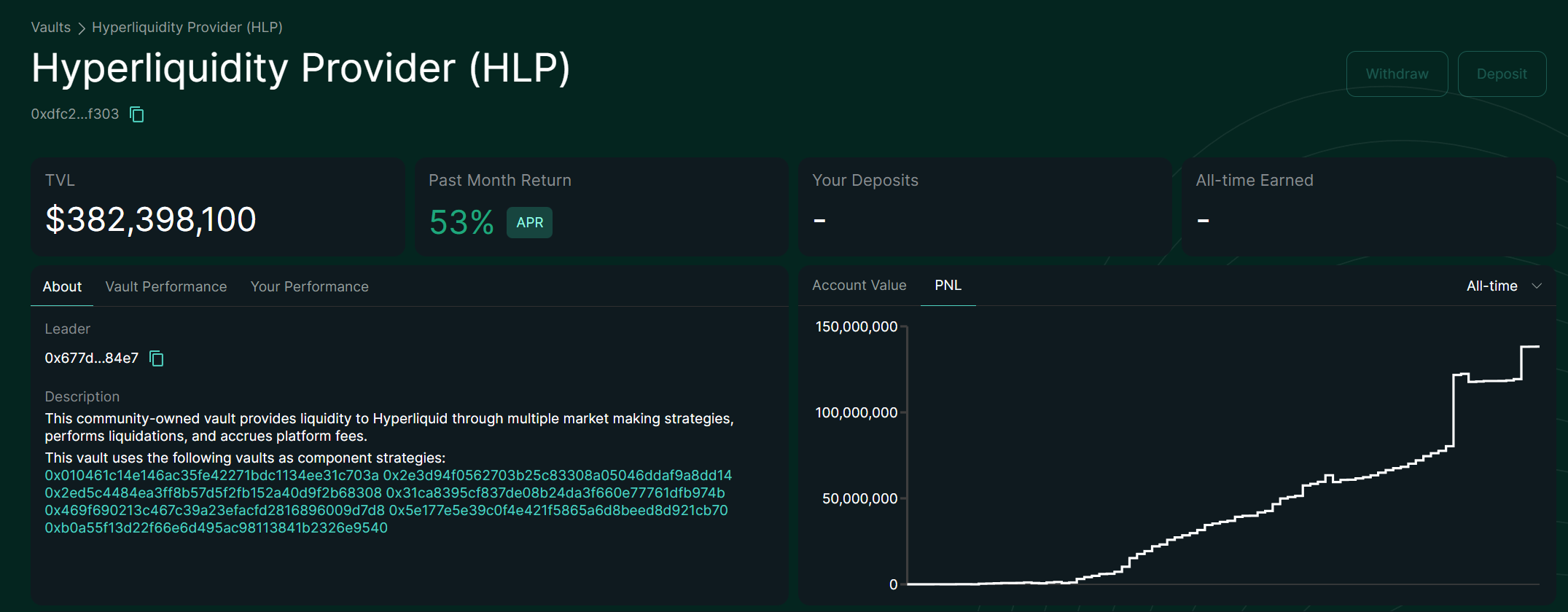 If you’re bearish, expect more market turmoil in the future which will lead to more liquidations = profits for the vault. That means this vault will continue to perform well above market rates. In 2025, the yearly yield was over 15%. In 2024, it was even higher at over 30%!