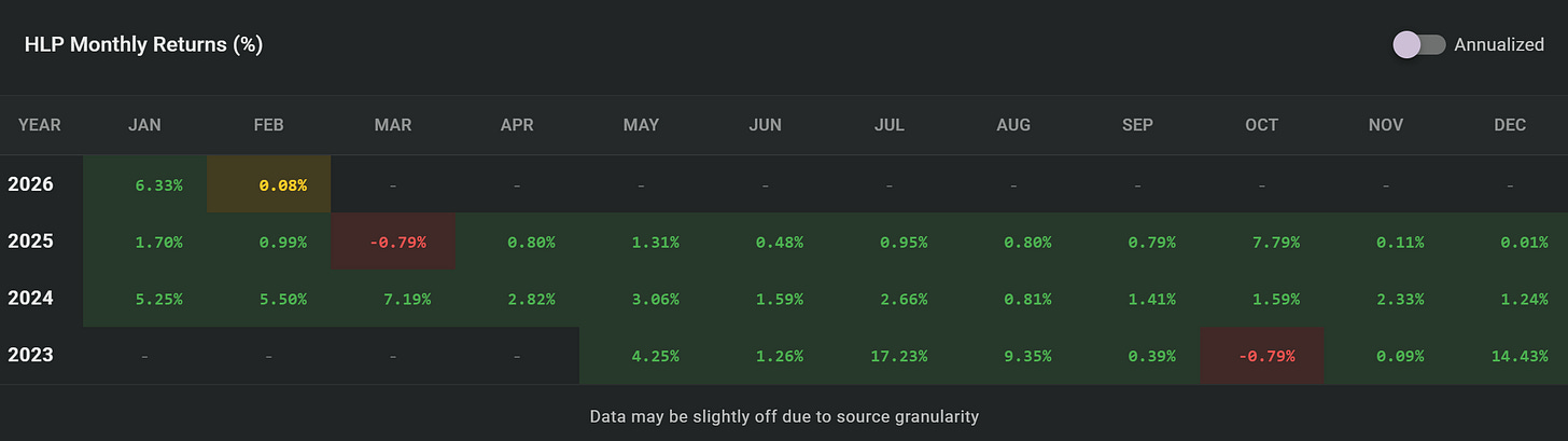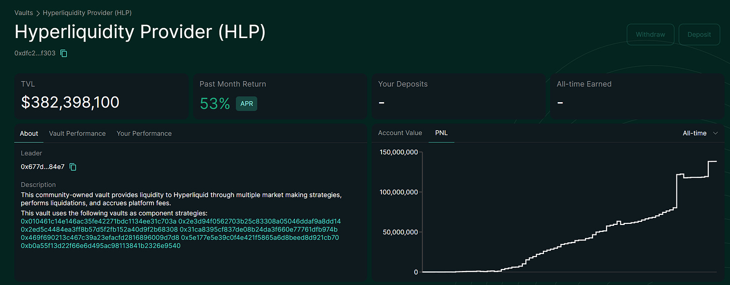 The Hyperliquid HLP vault is the undisputed king to farm yields in a bear market. That’s because this vault pays best in a bear market: the more traders get liquidated, the more profits you’ll make by depositing cash (USDC) in this vault.