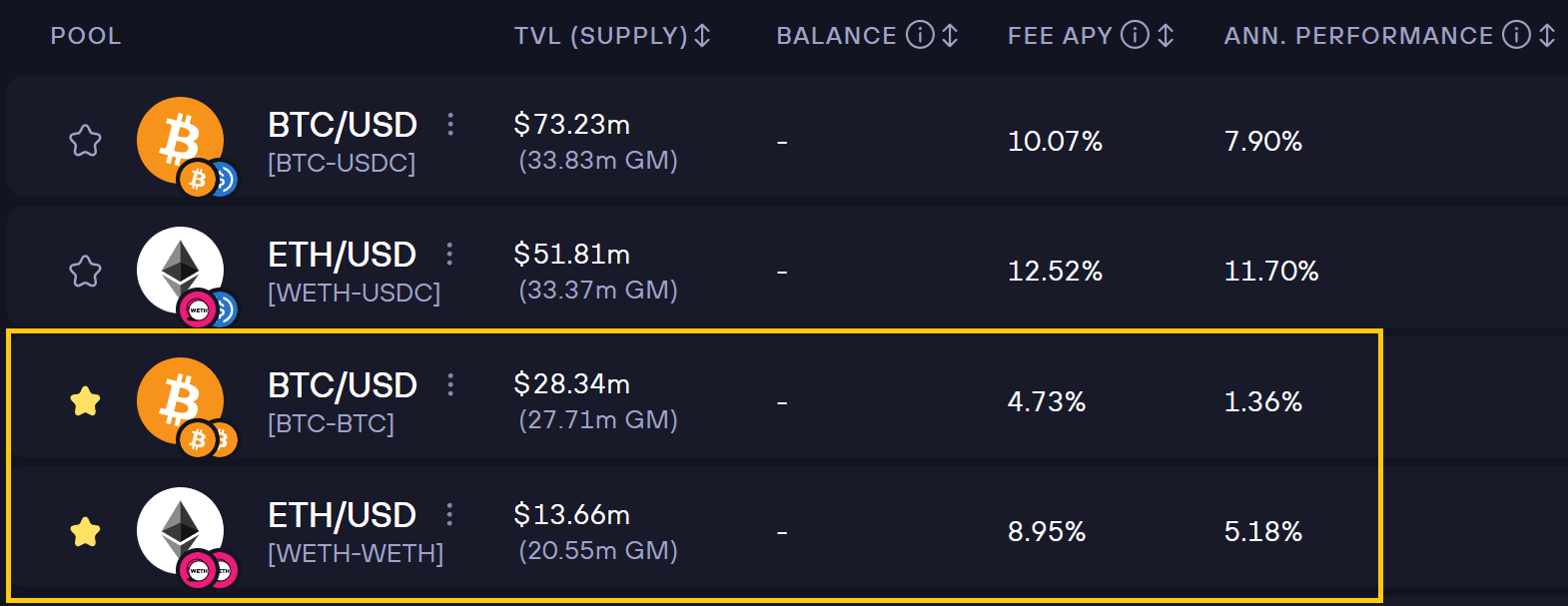 These yields are pretty solid all things considered since the ETH yield on AAVE is only 2%. On GMX its over 5%. On BTC, you will rarely find any yield over 2% without massive risks.