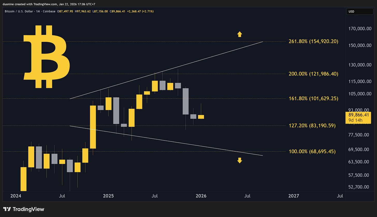 The optimistic scenario assumes this price action is a long consolidation in a large range which has held true for over a year. The BTC price is basically identical to a year ago. If 100k is reclaimed, bulls will return and push Bitcoin very high, very fast similar to how Gold has been acting lately. That makes 150k an easy target. We will probably know if this scenario is realistic by March.