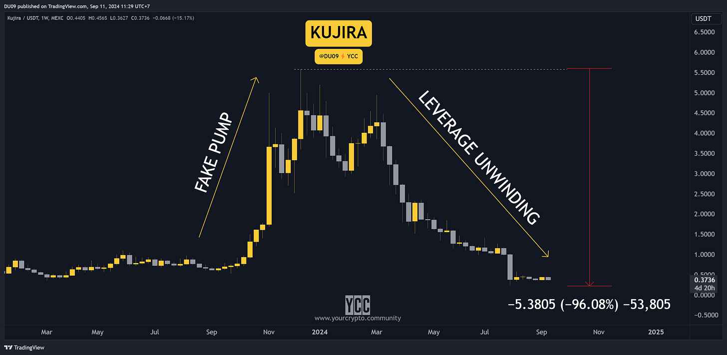 Kujira’s 15x pump turned out to be on fake money and leverage. The team basically used users money from their ecosystem to leverage their token price. When the market turned bearish, their ecosystem became insolvent.