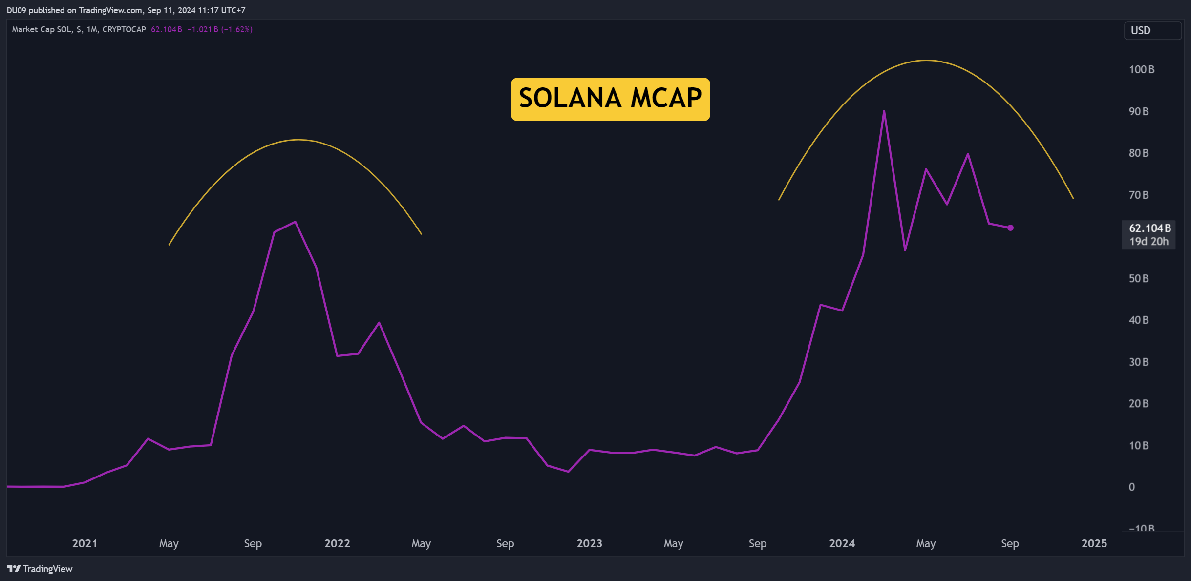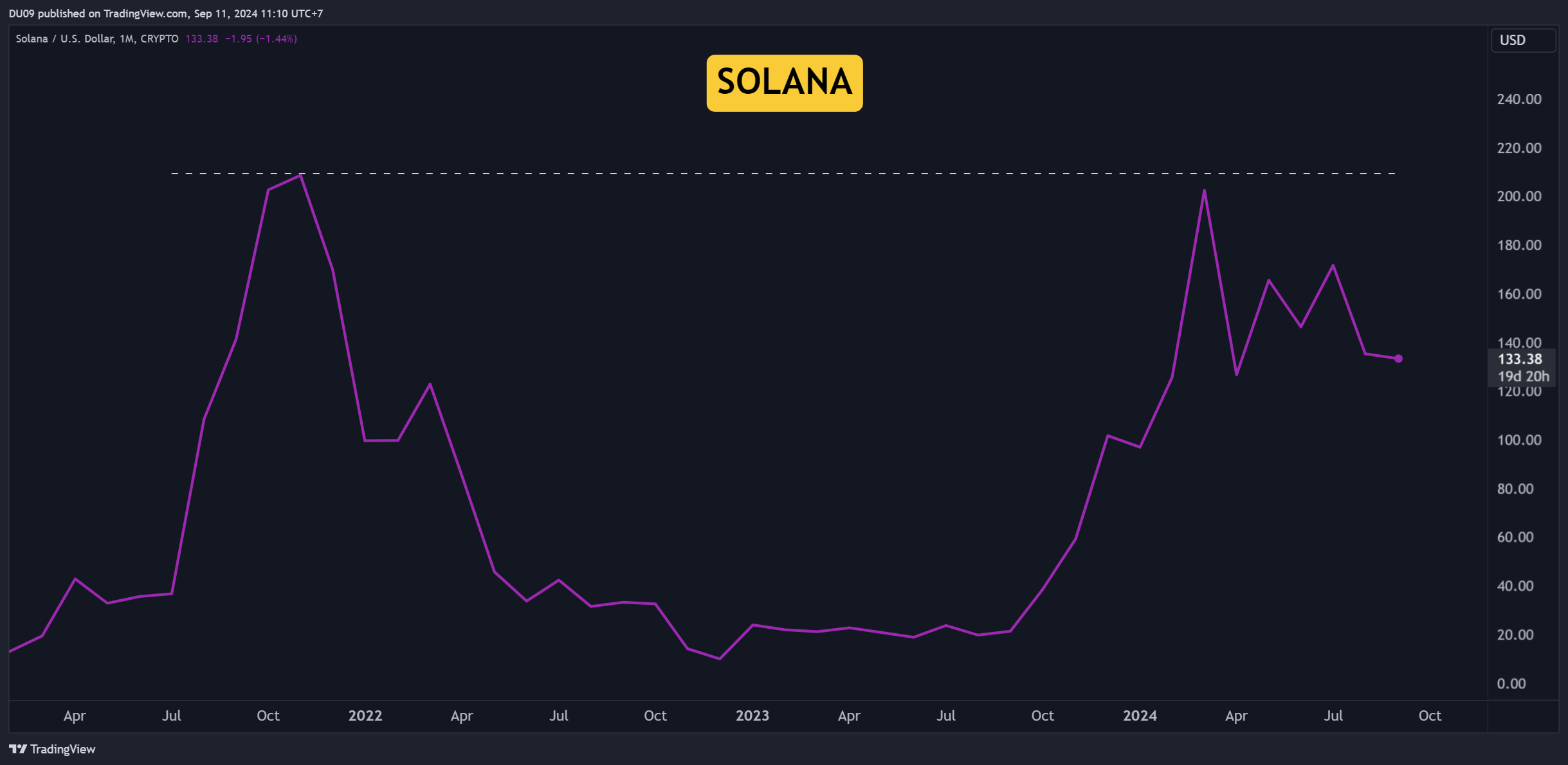 Even if Solana did a 25x in terms of price (from its 2022 low at $8), it never did a new all-time high to date. This should concern anyone that is still bullish on Solana. Remember the rule: higher highs = bullish; lower highs = bearish.