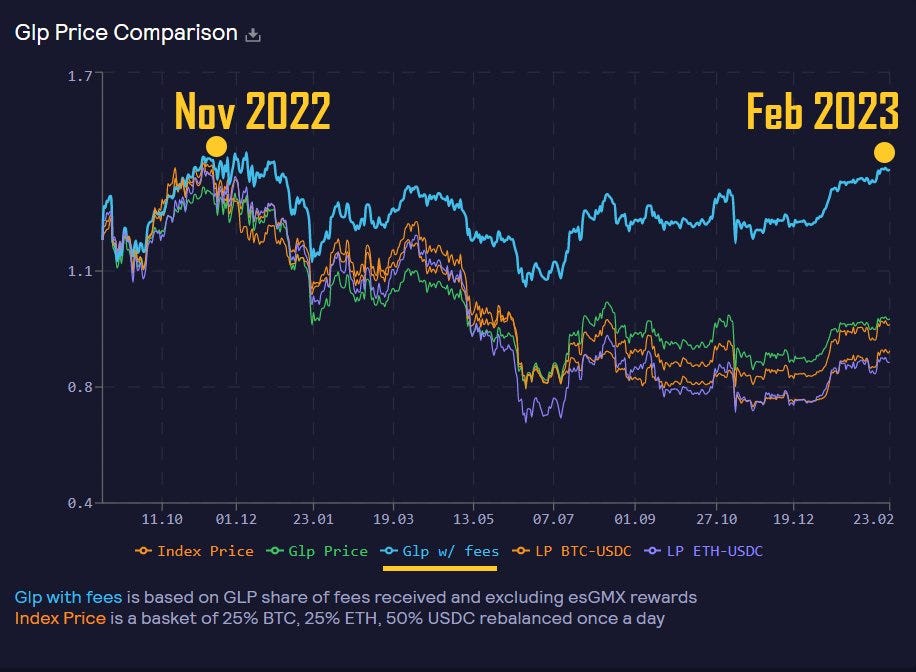 It shows that GLP holders pretty much went through this bear market without a scratch (check the blue line). The value of their GLP did not decrease! Yes it was volatile, but it was much better than 99% of the market during the same period thanks to the fees accrued.