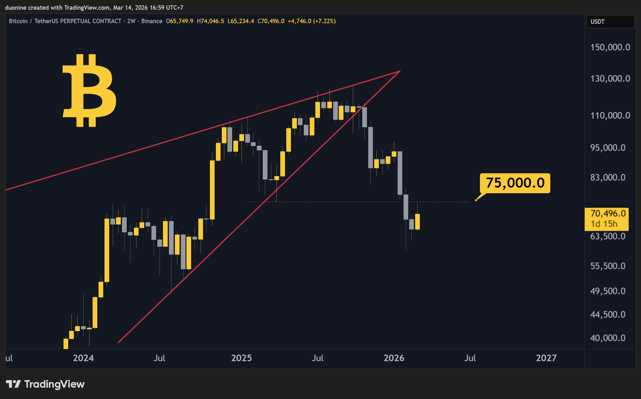 I’d look for longs if the price breaks above 75k and start shorting once it approaches 100k. Just be mindful that the global geopolitical context is rather volatile so things can change in an instant.