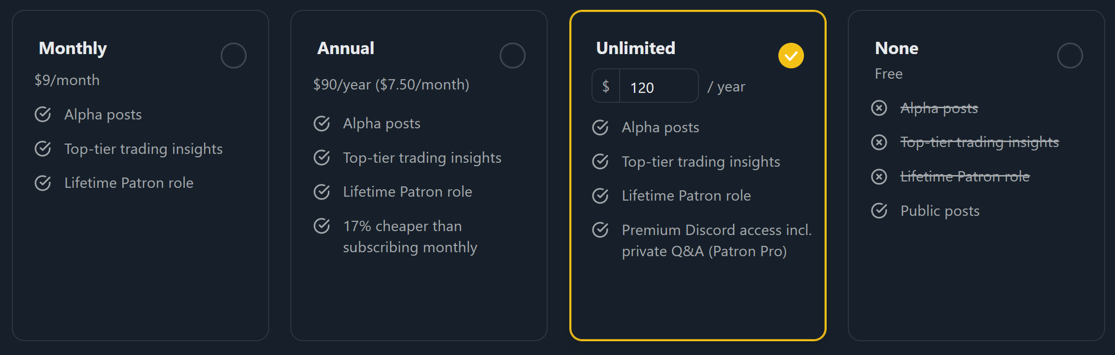 In the next 48h, the Unlimited Plan is $120 instead of its usual $190. This will grant you full access and a lifetime Patron Pro role on our premium Discord channels!