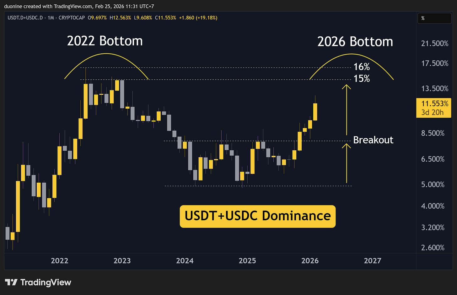 As you can see below, the stablecoin dominance has moved above 11% after breaking away at 8%. That breakout happened just after the BTC top in October 2025. That was a key signal to sell and stay in cash.