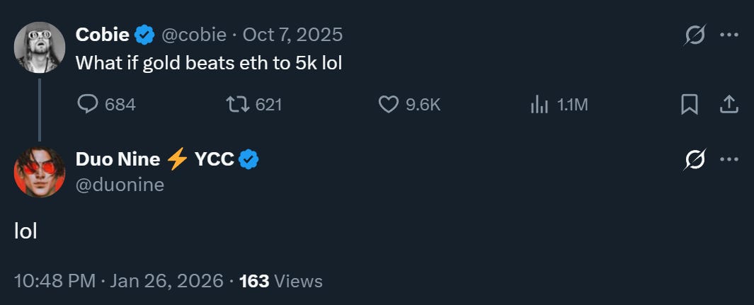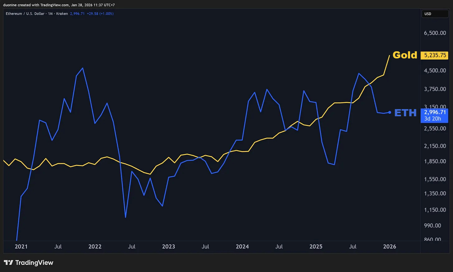 In the past year, Bitcoin and Ethereum have been moving sideways and most altcoins crashed. Last year, people joked that Gold may hit $5,000 before Ethereum. Well, that joke became reality this week.