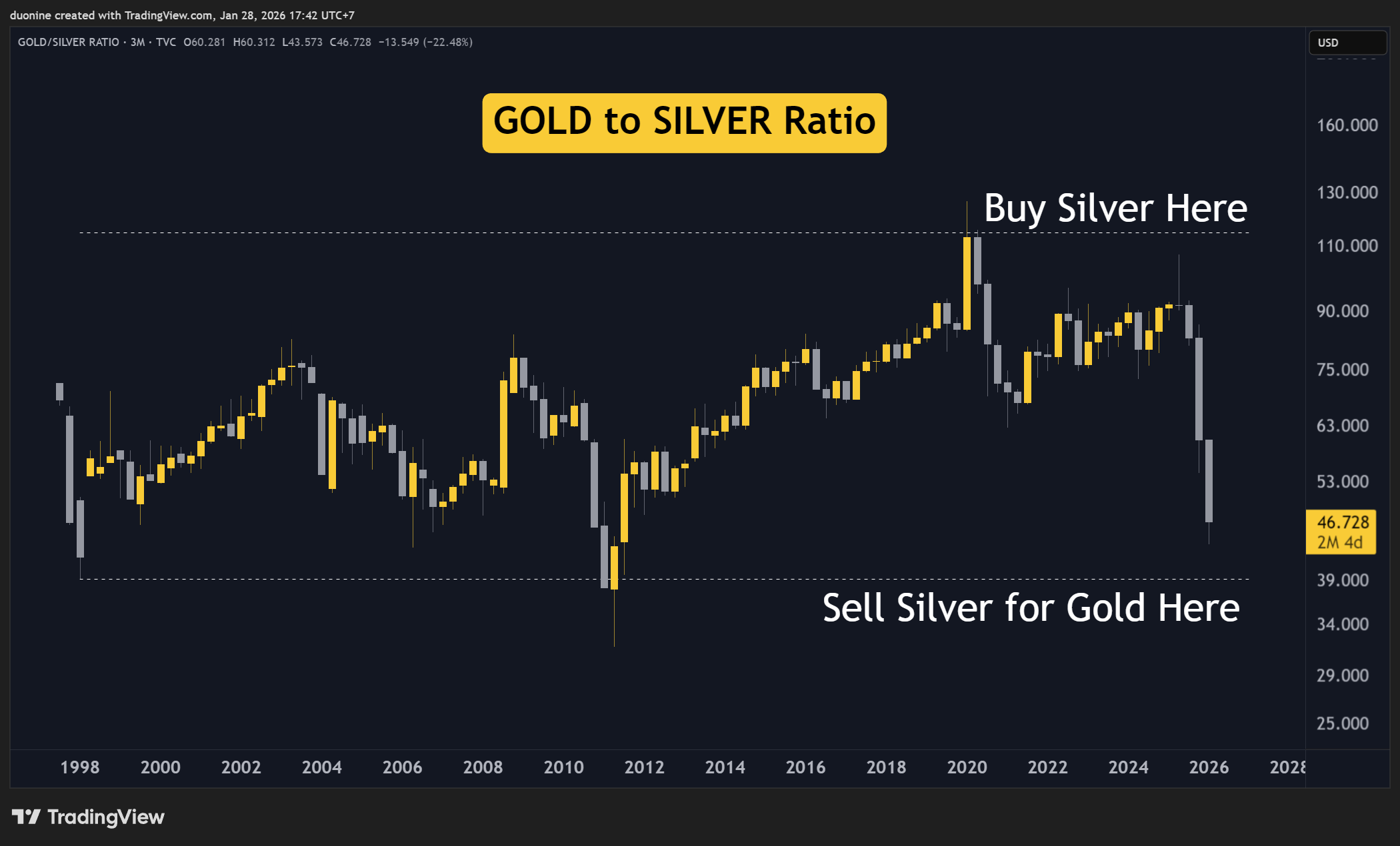 If you already hold Silver, this is the time to think about rotating it into Gold. I do not recommend buying Silver here or above $100. You’re taking too much risk.