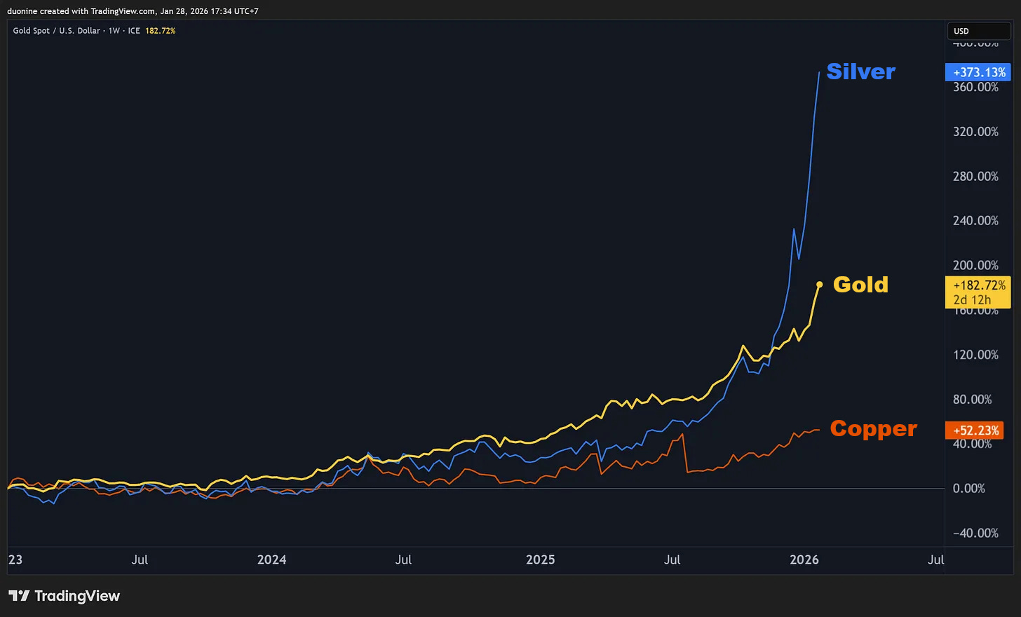While everyone in crypto was looking for the next pump, precious metals rallied like we’ve never seen before. Silver was less than $30 a year ago, today it hit $117. That’s a 4x return on your money. Crazy.