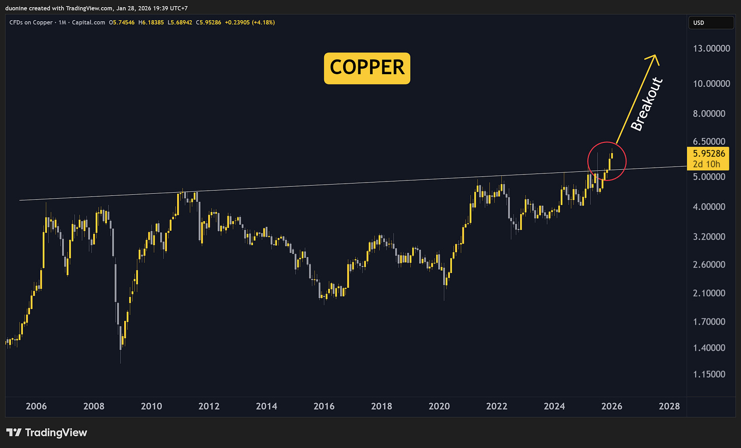 Lastly, Copper broke away from a massive and long consolidation, presented below. This can easily hit $10 or higher later on. If you can get access to spot, not a bad hold in the next year or two. You can hold Copper futures on Hyperliquid, but the funding rates will erode any gains.