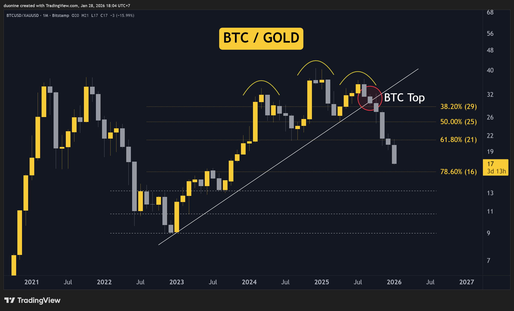 Historically, the BTC/Gold ratio was always on point to signal a top for Bitcoin. This happened again in September 2025 when Bitcoin topped at 126k. Since then, BTC quickly fell against Gold. That coincided with the breakdown on the below chart, highlighted in red.