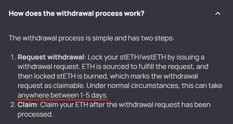 That’s a recipe for disaster and panic in a bear market as people rush to where liquidity is still available. For example, under normal circumstances, it can take up to five days to get back your ETH if you have stETH, as shown below.