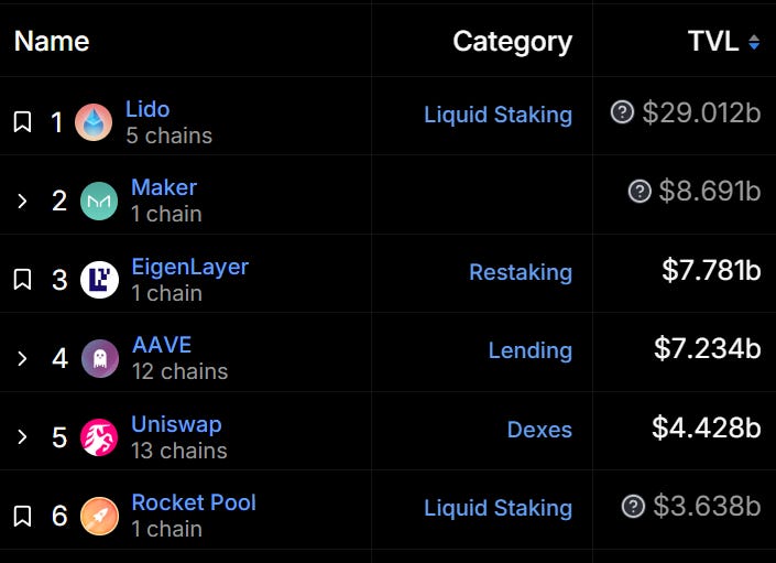 EigenLayer also raised billions in staked ETH thanks to similar incentives. If you look closely at the DeFi protocols on ETH you will see three of the top six are in the stacking business. That’s a lot of billions and they will only grow as the bubble inflates.