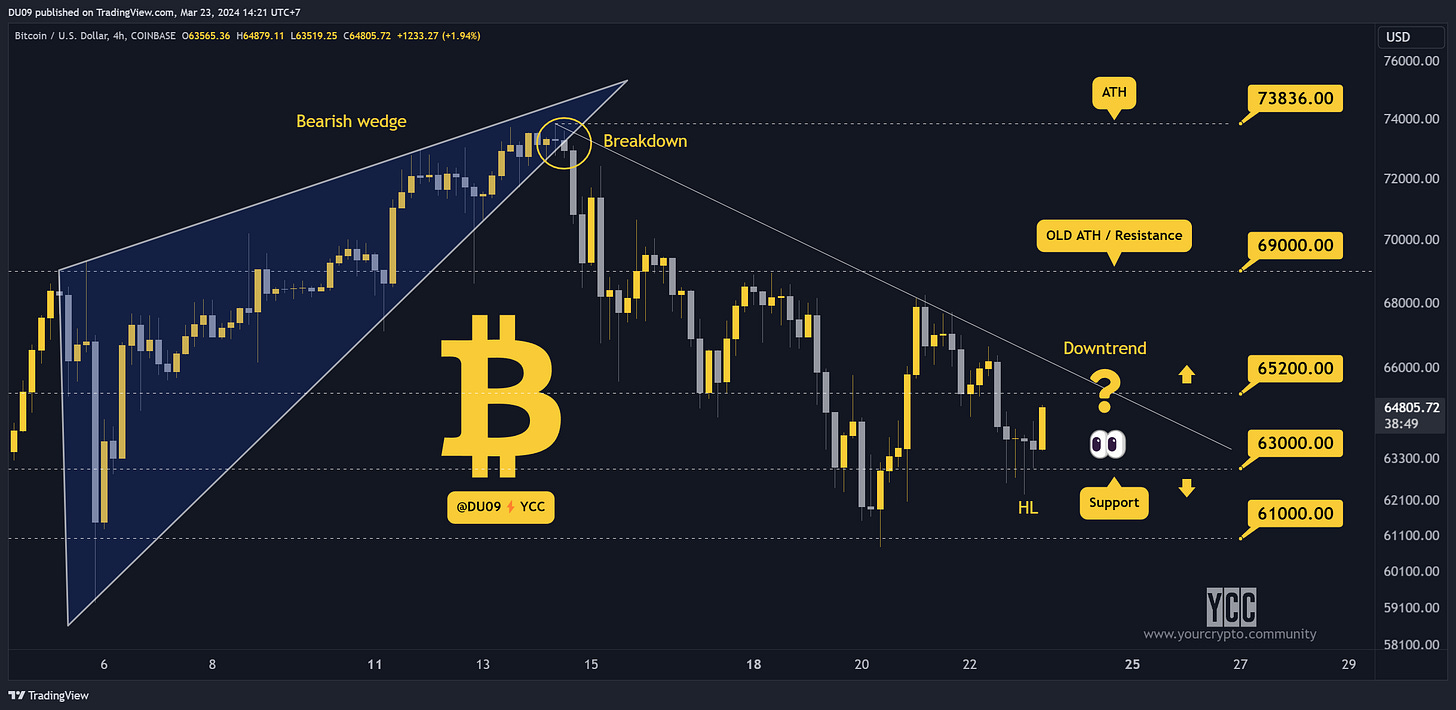 Today, Bitcoin made a higher low at 63k and as long as this holds, there is no reason to believe the price will make new lows. If so, those that bought the discounts will be rewarded soon. These assumptions are invalidated if BTC falls under 60k.