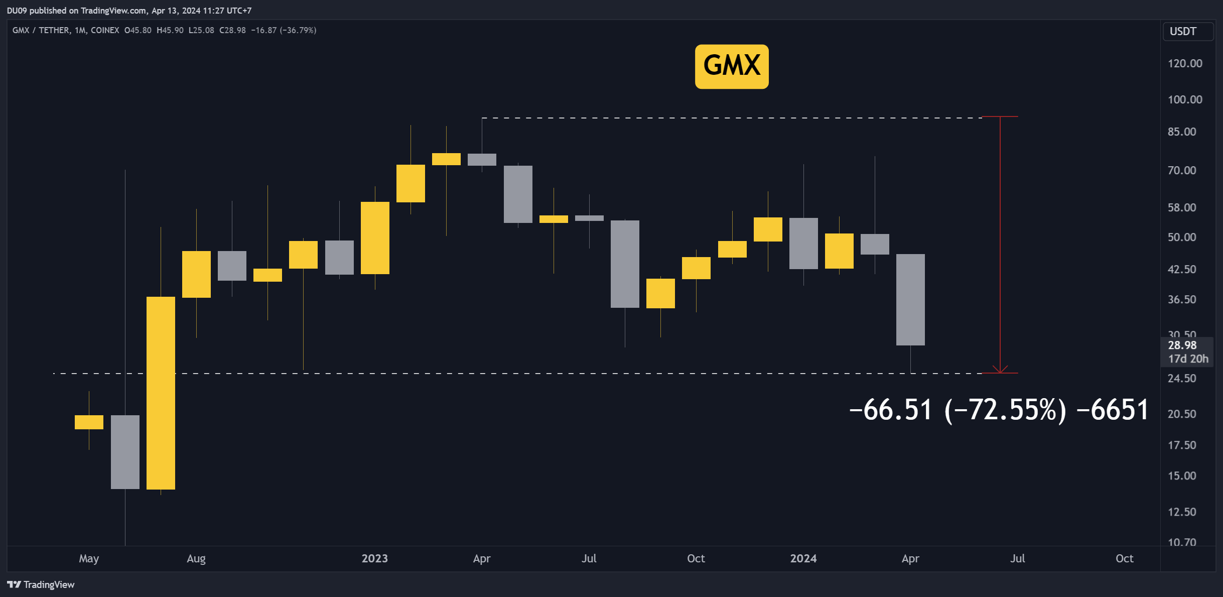 First, let’s take a look at GMX since I mentioned it earlier. Its price crashed by 72% from the all-time high and erased almost all gains since its release. That’s a bear market price action in a supposedly bull cycle. What is going on here?