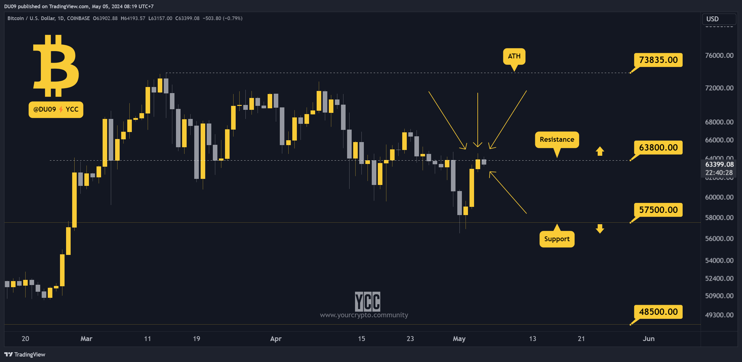 TLDR: Bitcoin is at a critical level. Break above the 64k resistance and the bull party resumes. Fail there and BTC could fall to new lows. Next week is going to be decisive for the market.