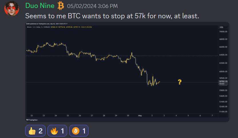 I also mentioned BTC was keen to reverse at 57k before the altcoin pump in our Patrons Pro group. Entries there were excellent, even Bitcoin pumped 10% from that level!