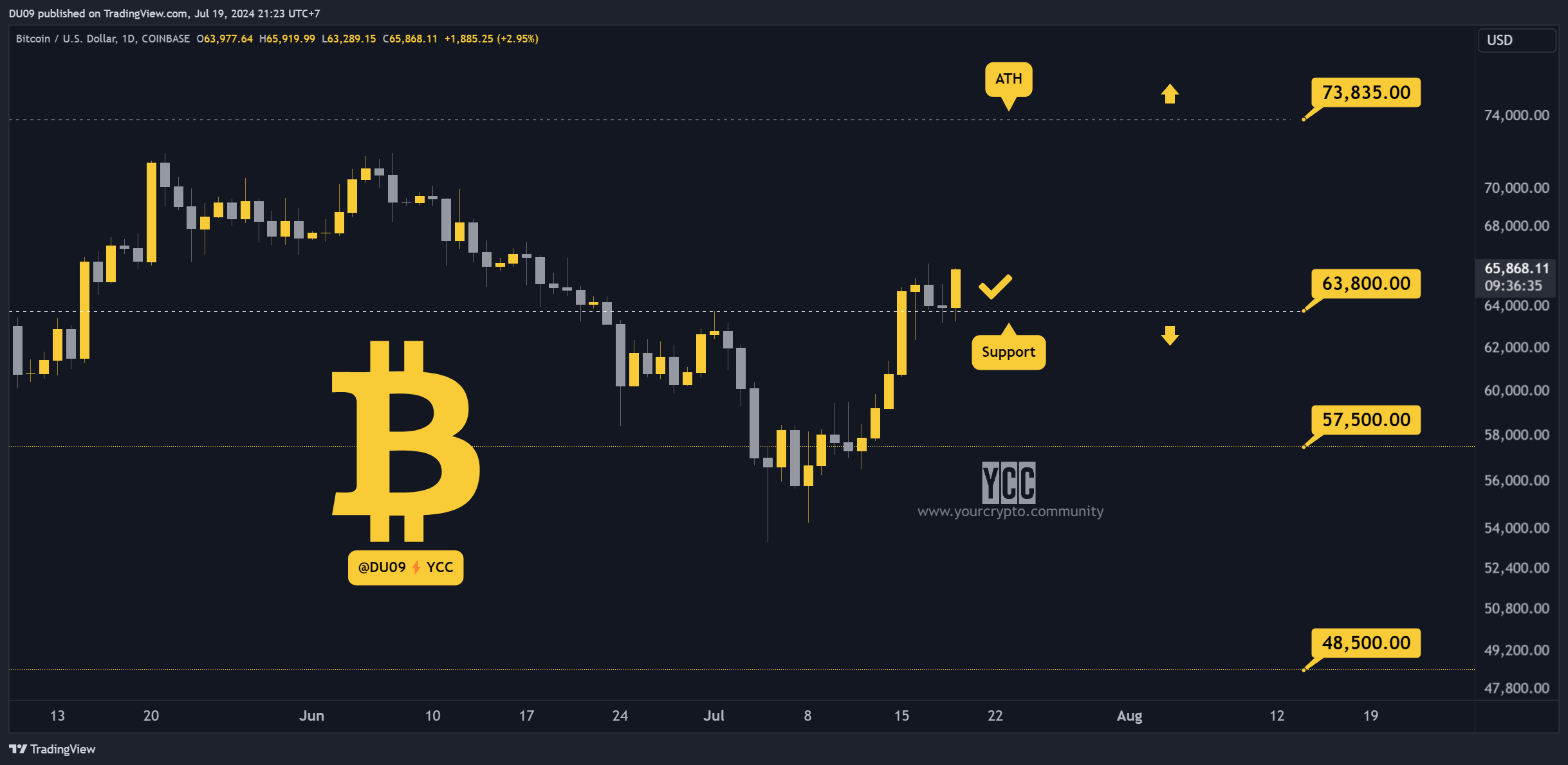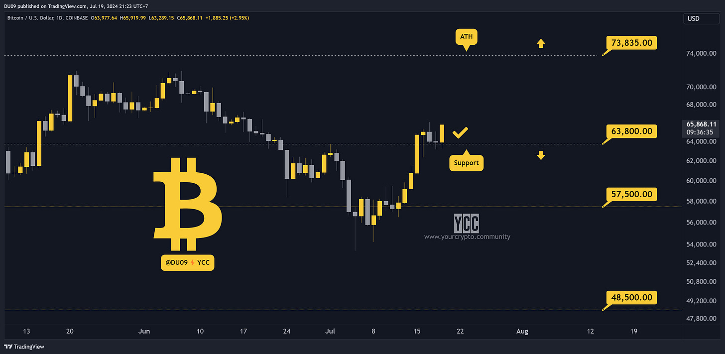 TLDR: Bitcoin is BACK! After scaring the market with a drop to mid 50k, the price quickly recovered and is now above the critical support at 64k. Optimism is back with most of the market in green. The next target is the ATH at 74k!
