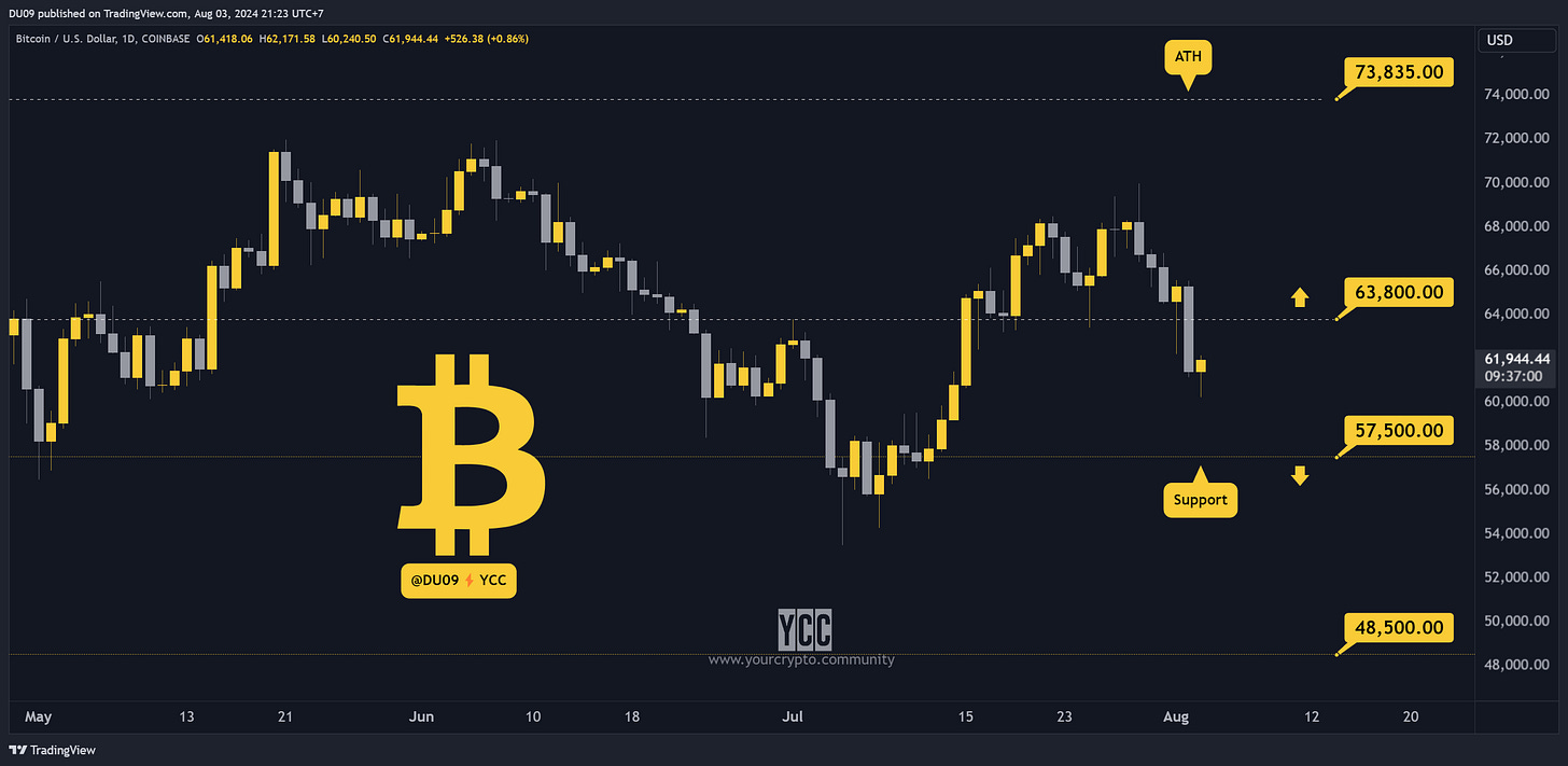 This week, BTC lost its support at 64k. That puts the price action into a neutral territory (64k to 58k) from where anything can happen. I will turn bullish if the price returns above 64k and bearish if Bitcoin makes a lower low under 54k.