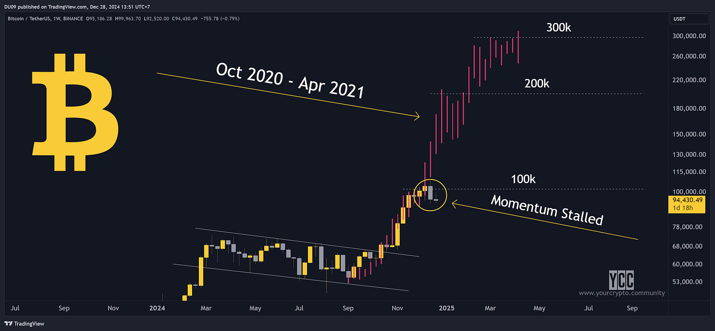 As you can see on the chart, the price failed to keep the same bullish momentum like in the pink projection from the 2020-2021 rally. This means Bitcoin will likely top somewhere between 100k to 200k based on this.