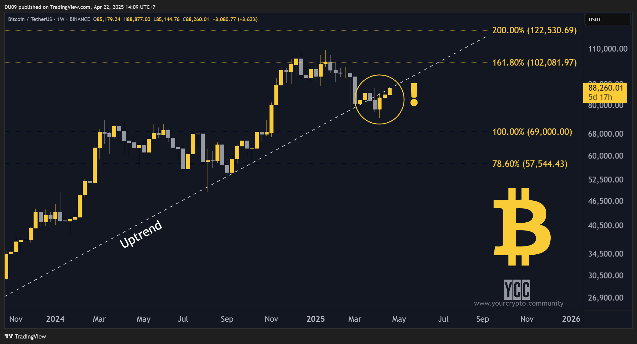 If this bullish momentum is sustained, then Bitcoin has a high chance to reclaim its uptrend that was lost back in March (see the chart). This would likely bring back optimism and see Bitcoin move beyond 90k in a short amount of time.
