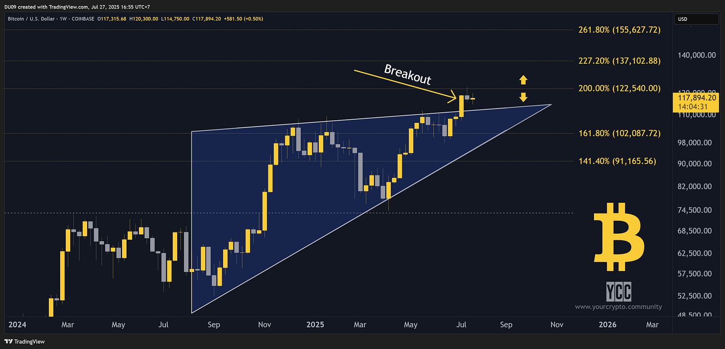 The rejection at the 123k resistance should not be too concerning. Bitcoin may even decide to re-test its breakout point from the blue triangle at around 112k. That’s still bullish if it happens and a great entry if you missed BTC around 100k as indicated in my previous alpha updates.