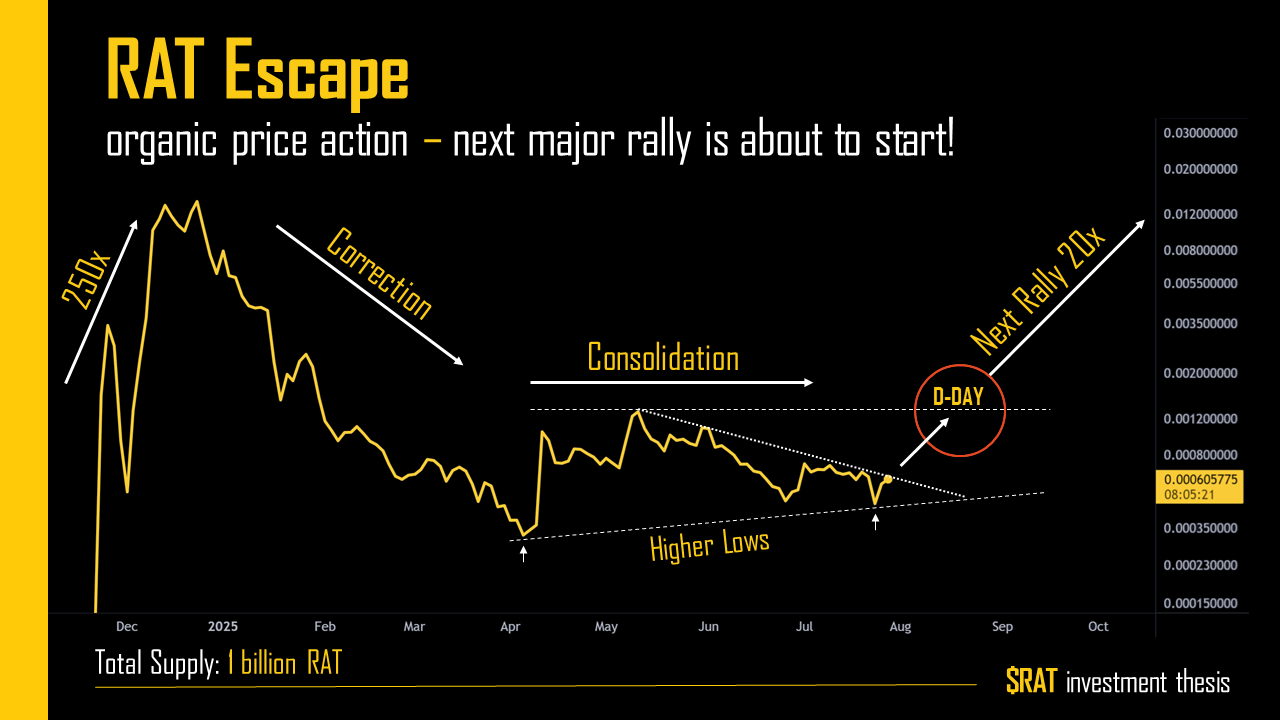 I am bullish on RAT because it completed its correction back in April and is now found at the end of a flat consolidation. This normally precedes a new major rally which I expect to happen whenever the price breaks above $1.5M market cap (D-Day in the picture).