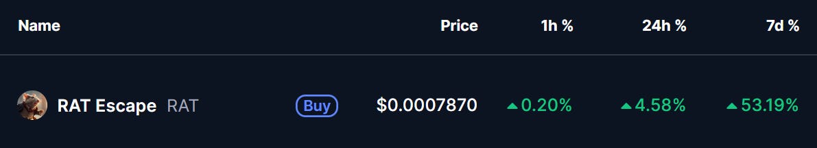 One such example is RAT Escape, our community meme token. I’ll use this as an example to explain my point before I dive into the other altcoins. As you can see, RAT is up 53% in the past week while most alts are in red.