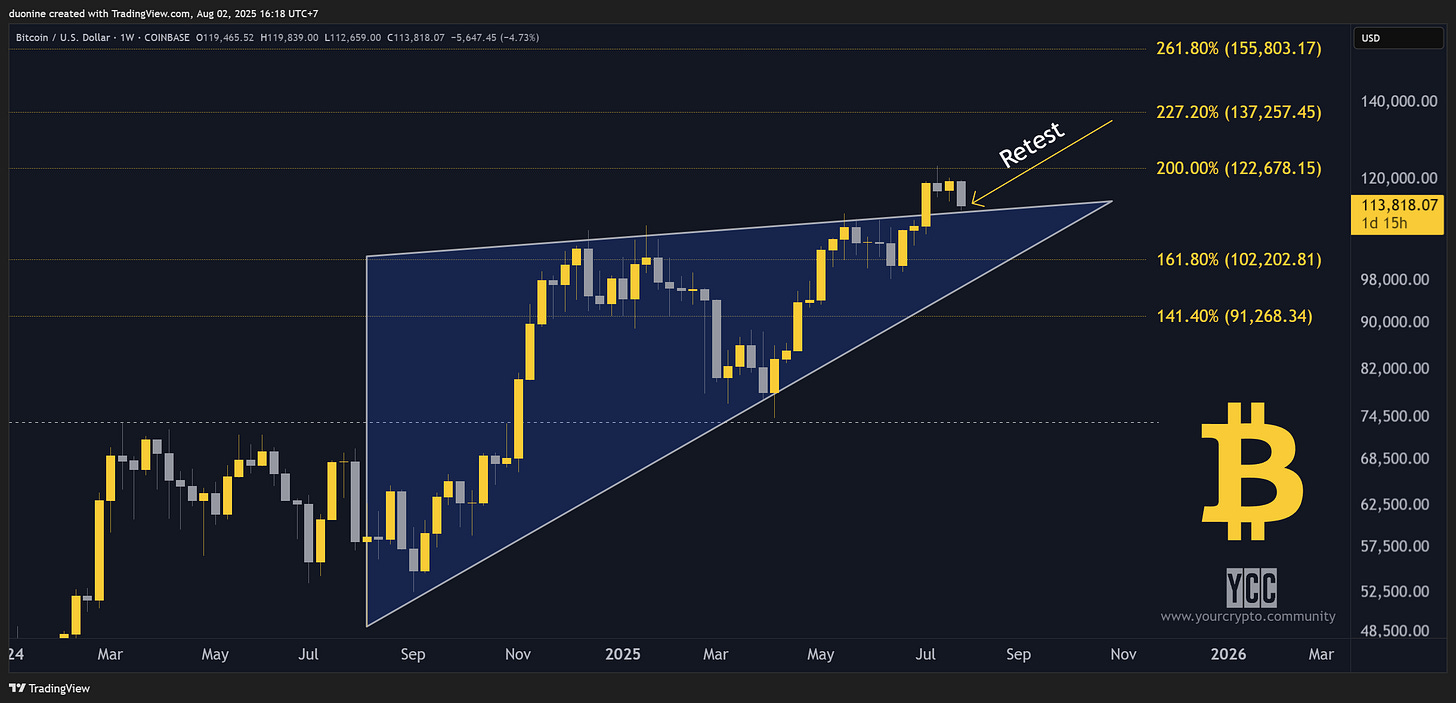 TLDR: Bitcoin is re-testing its breakout at around 112k. As long as the price does not close inside the blue triangle on the weekly timeframe there is no reason to worry.