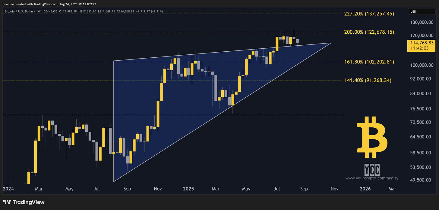 It is the second time Bitcoin tests the $112k support in August. So far, it held well and buyers came rushing in on Friday when the US Fed Chairman, Jerome Powell, hinted at lowering interest rates in September.