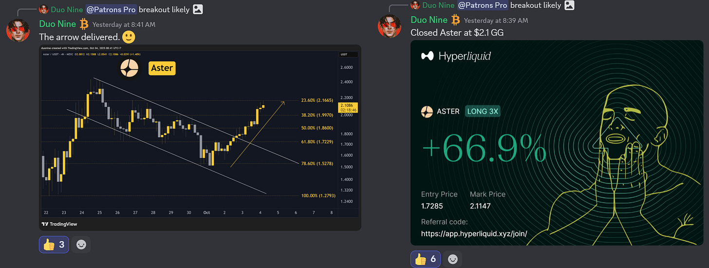 The second opportunity is simply being active and in our Discord in the months to come, especially if you are already subscribed to the Unlimited plan. I post my trades there live and made 67% profit on Aster this week in a few days. That’s on top of the 300% profit during Aster’s launch not long ago.