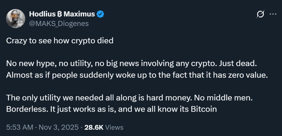 Therefore, I will pause judgment until December on Bitcoin. Hope we get another nice pump before things get ugly in early 2026. That is a prime period for the bear market to start if conditions deteriorate after December.