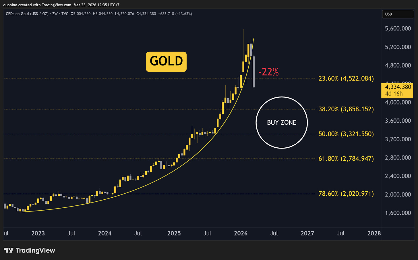 The actual panic will start when the stock market crashes as well. NASDAQ is already down 10%. The macro is primed for a major crash which will also pull down Gold. At that moment, I’d buy Gold hard. Key levels on the chart with the 3k to 4k zone as a great area to accumulate. Lowest it could go is 2.8k I’d say.