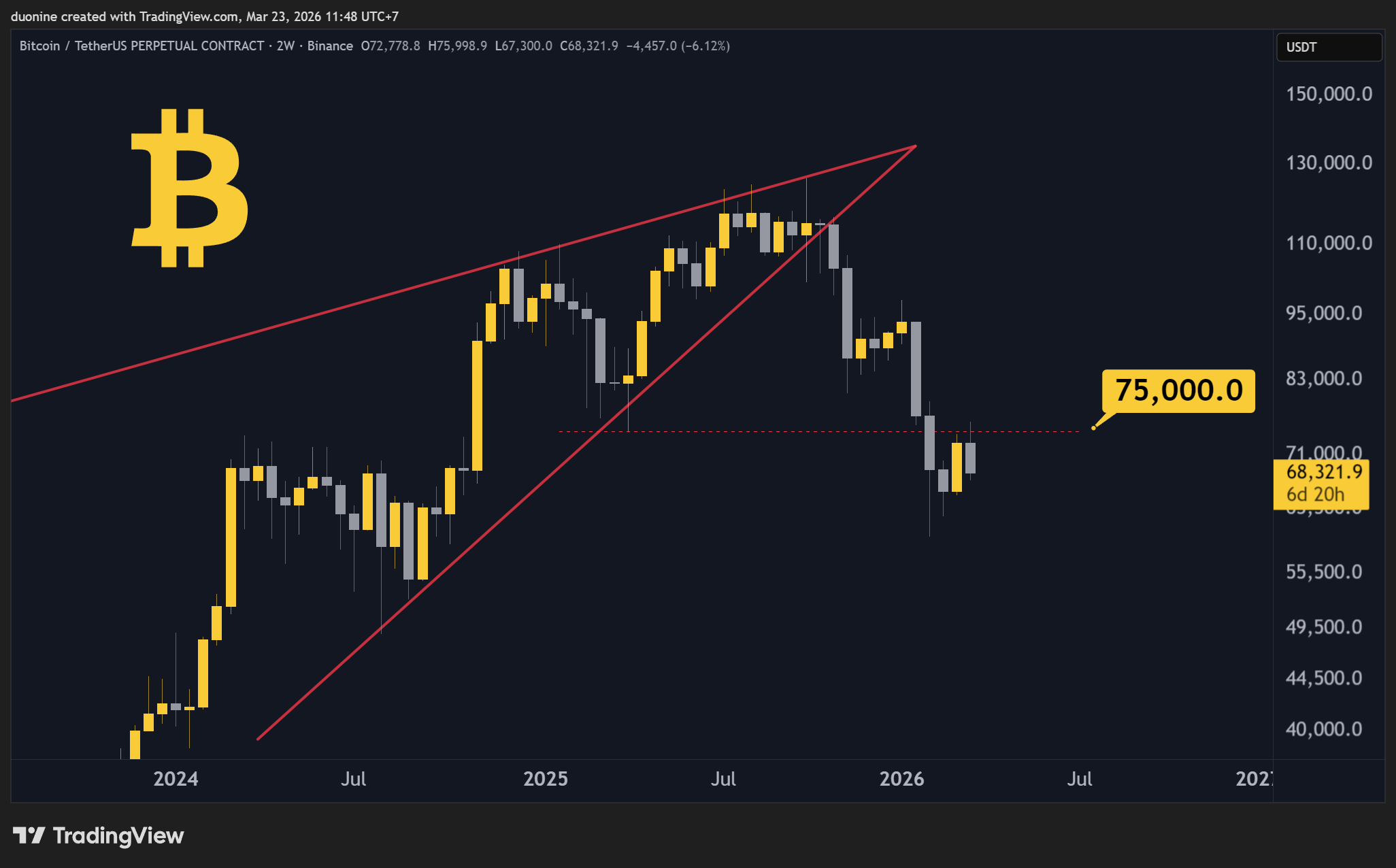 BTC TLDR: Bitcoin tried to break above the 75k resistance, but was sharply rejected. This is bearish. If the price falls under the 60k support, expect 50k and lower.